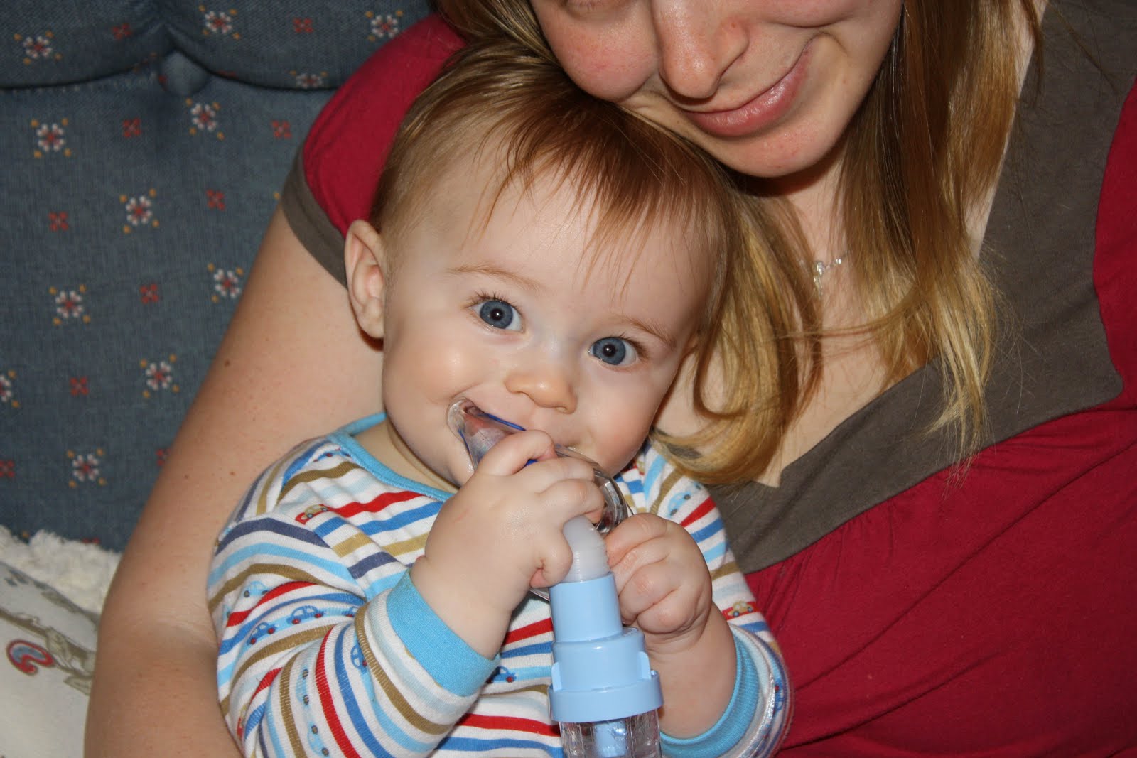 Unfortunately all three boys are sick in our house (us girls are just too tough!). I feel bad for Collin b/c he's dealing with the typical post shot symptoms + started showing symptoms that his big brother had shared some sick germs with him just a few hours after his appt. Both boys are running fevers, coughing, and snotty. Benjamin's been having some breathing trouble too, so we've started his breathing treatments again. They both have had trouble sleeping (big yawn for this Momma) the last few nights, so I decided to move Collin into his bouncy seat so he could be elevated. Here's the sweet monkey tonight: