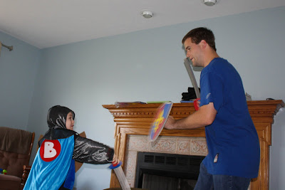 At the Scottish festival, the kids got to paint shields. Benjamin was excited when he woke up that the paint was finally dry. So the boys (Dave and Benjamin) had a grand time "swording" together now that they both have swords and shields!